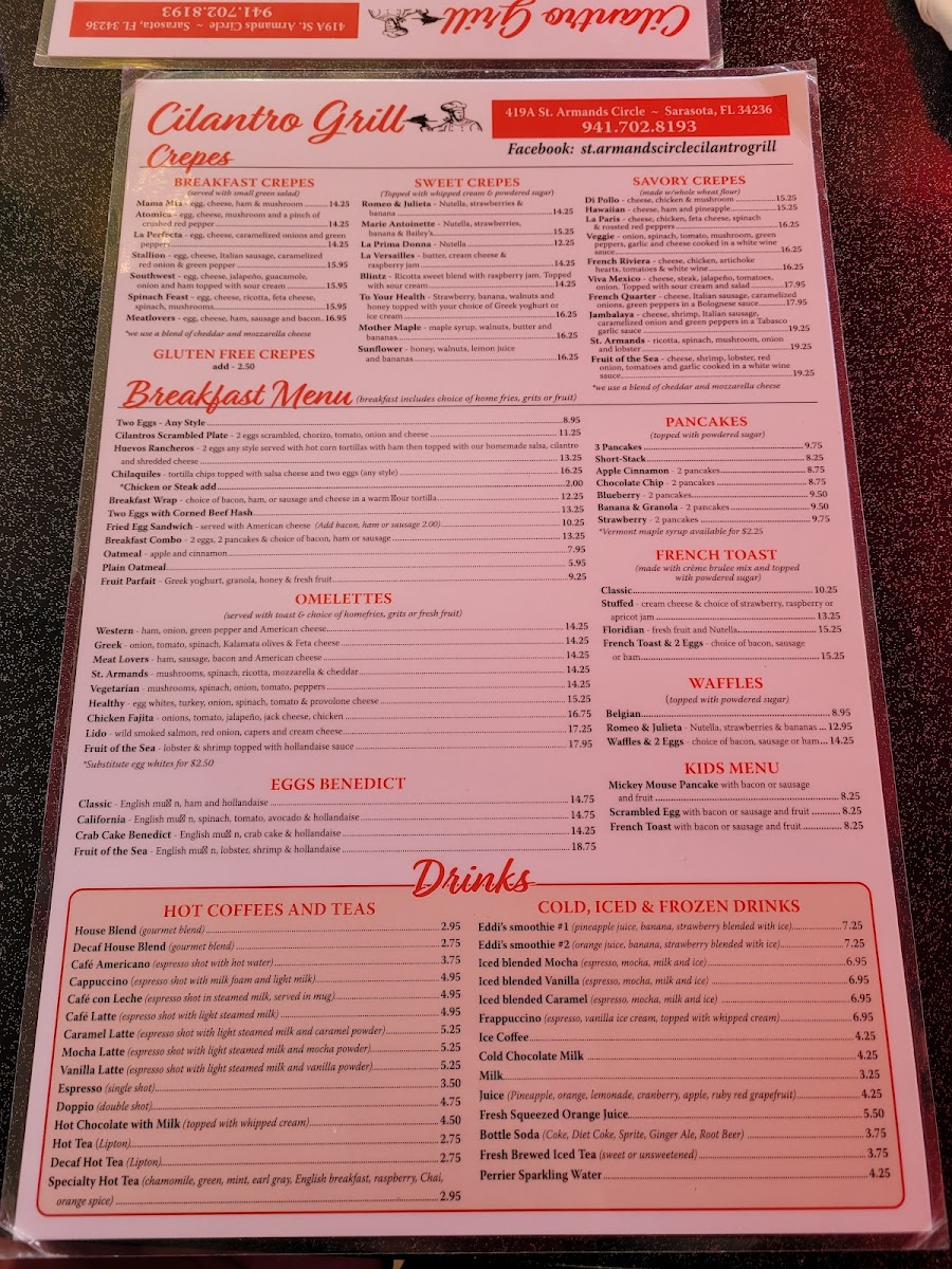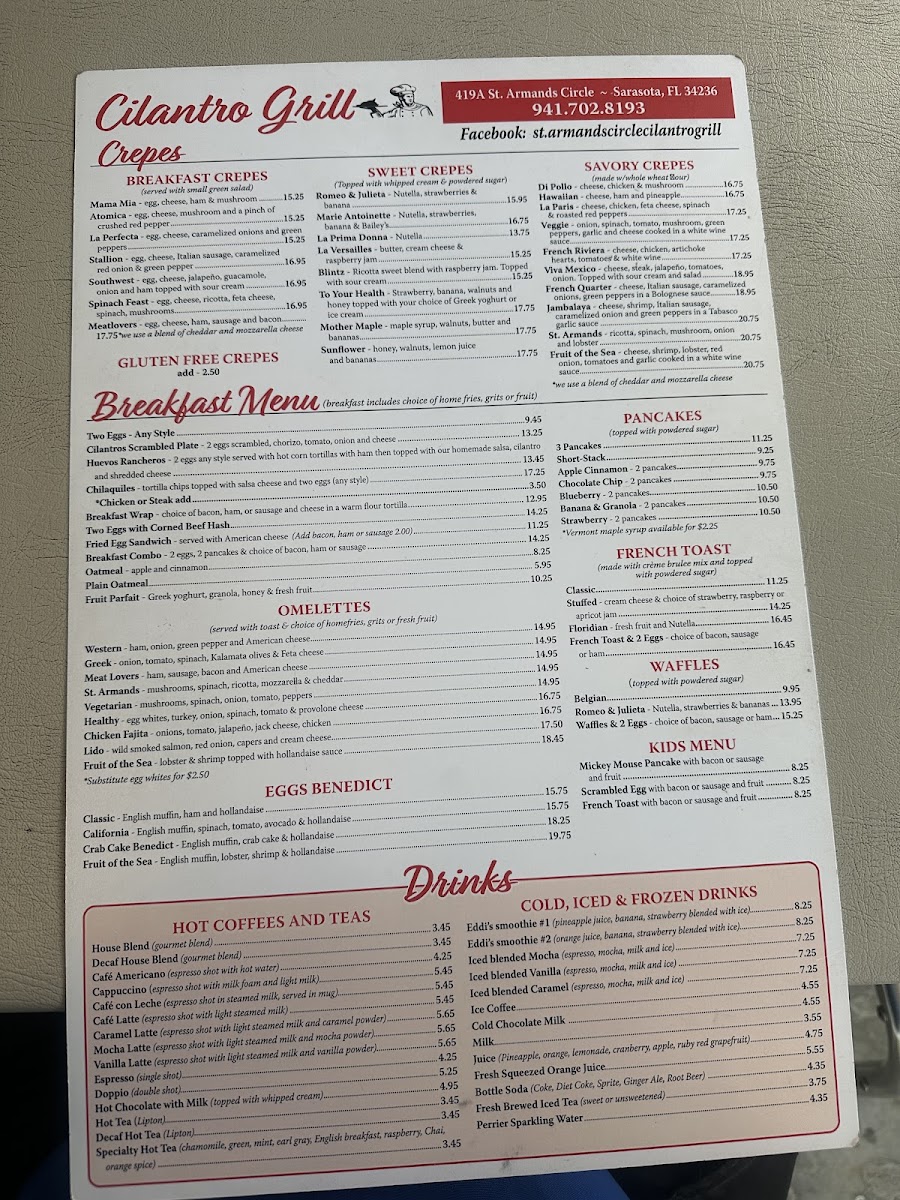 Welcome to Cilantro Grill, a vibrant gem located at 419A St Armands Circle, Sarasota, FL. Renowned for its irresistible breakfast selection, Cilantro Grill offers a delightful menu aimed at satisfying various palates. Customers rave about the expertly crafted omelets and their perfectly proportioned breakfast dishes, often paired with refreshing cocktails like Mimosas and Margaritas—ideal for a sunny Sarasota morning.